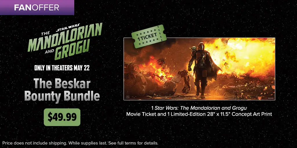 There are some other things from Fandango for the ticket sales of The Mandalorian and Grogu. For $49.99, fans can purchase the The Beskar Bounty Bundle, which includes one movie ticket to The Mandalorian and Grogu, and one Limited Edition 28″ x 11.5″ concept art print.